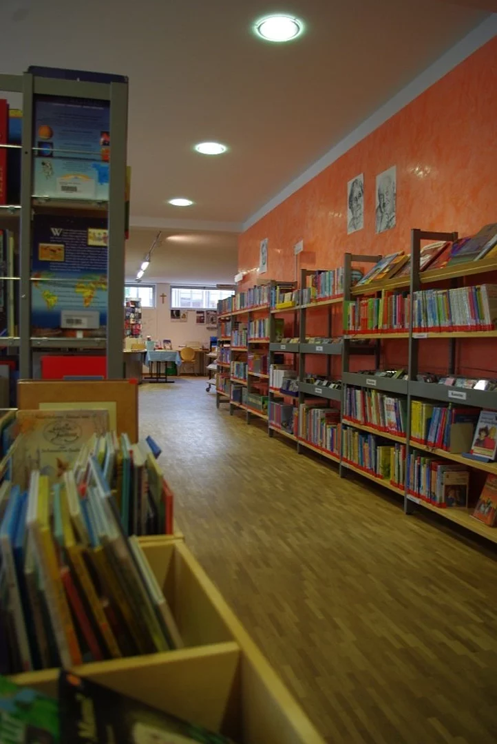 Zum Bestand von etwa 8.700 Büchern/Medien gehören Kinder- und Jugendbücher, Belletristik/Schöne Literatur, Sach- und Fachbücher und Zeitschriften, sowie CD, MC, DVD, Hörbücher, elektr. Spiele u. ä. Alle Bücher/Medien, mit Ausnahme der Nachschlagewerke und der neuesten Ausgaben der Zeitschriften sind kostenlos ausleihbar.