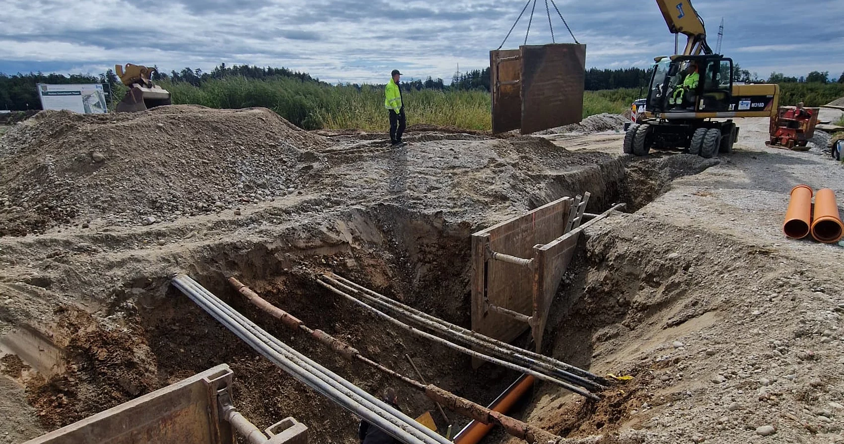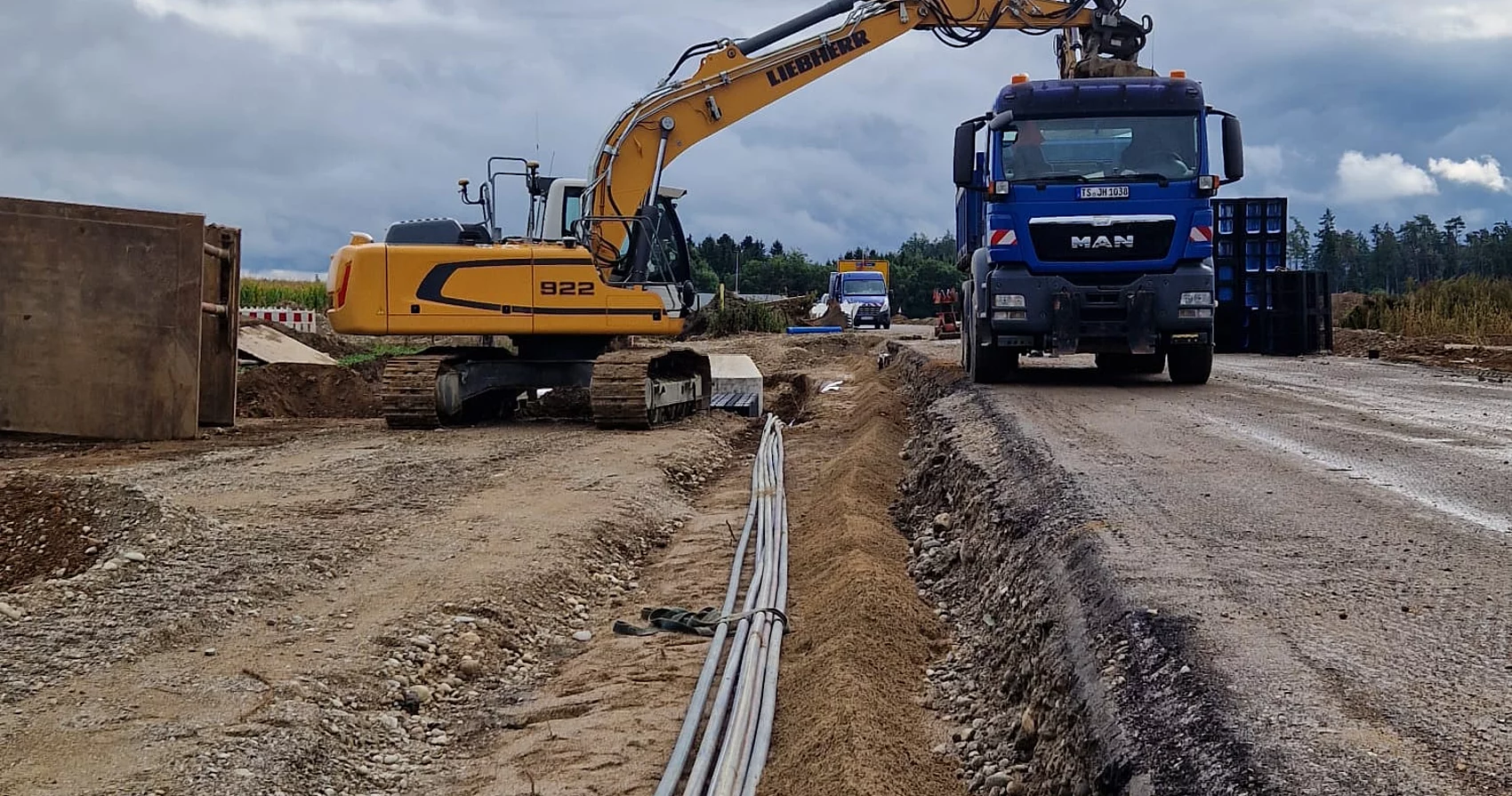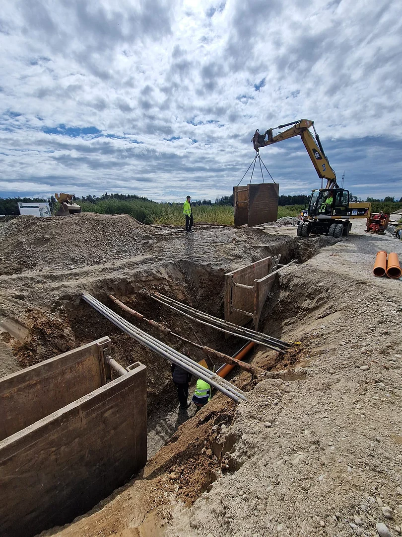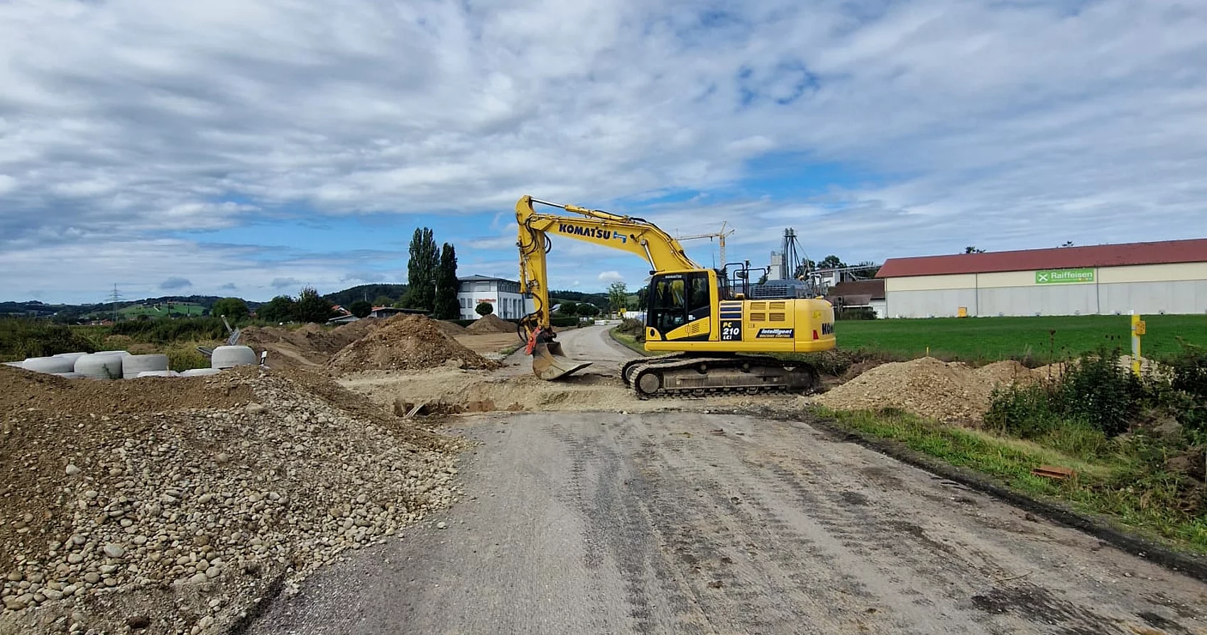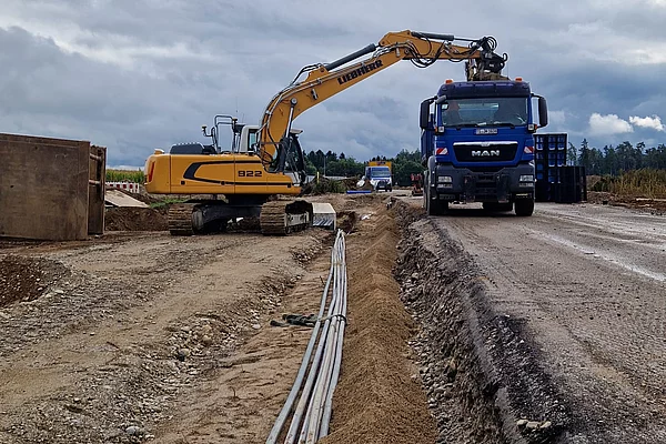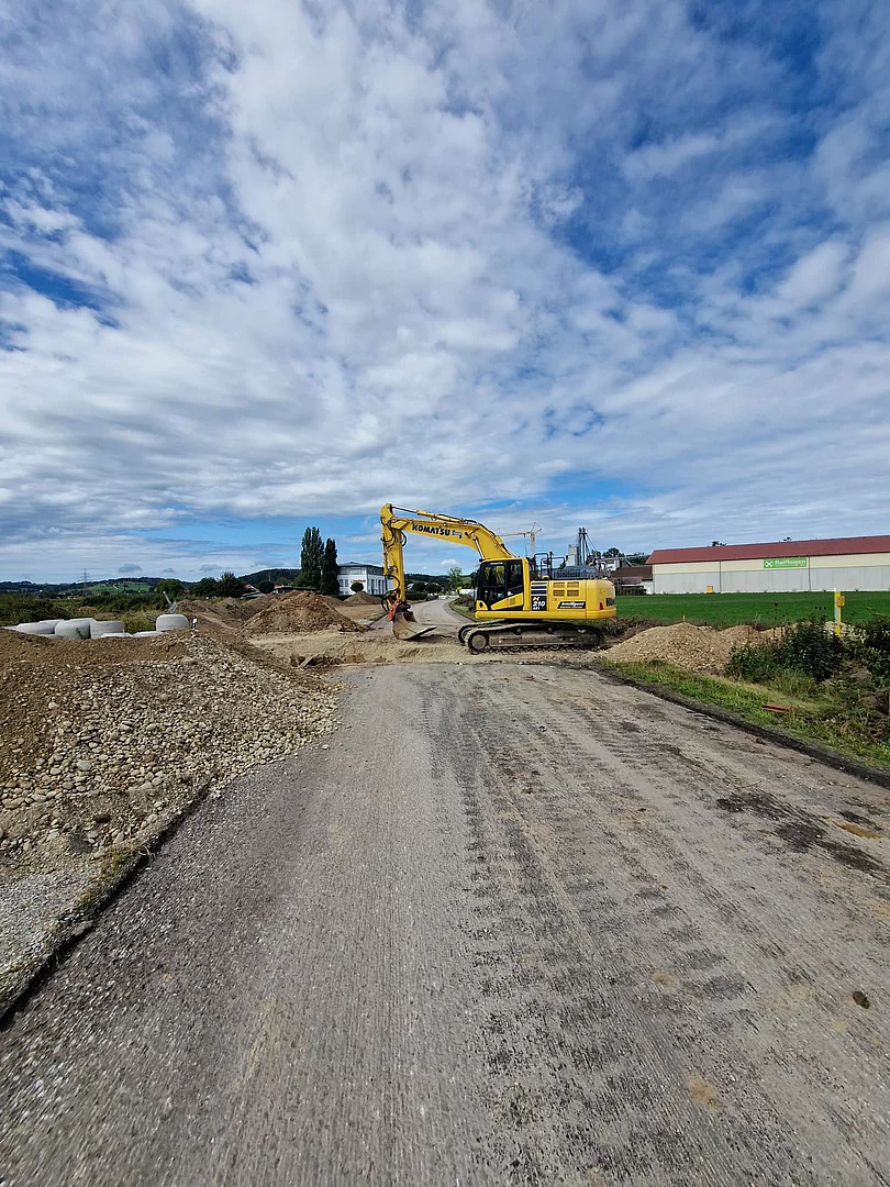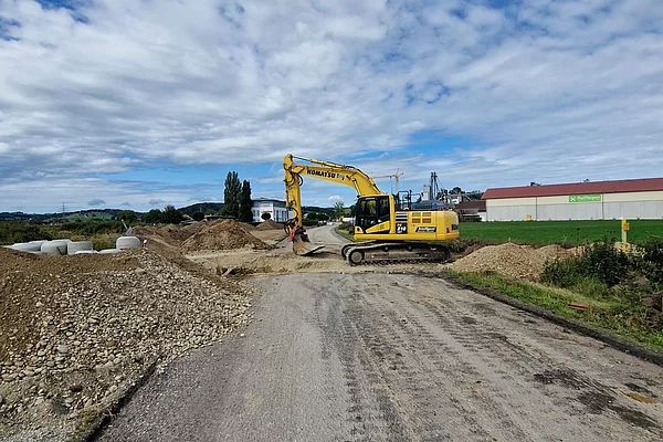 Die Firma Josef Hogger Tiefbau e.K. führt derzeit die notwendigen Arbeiten durch, um das Gebiet mit Straßen, Versorgungsleitungen und Infrastruktur auszustatten - damit bald neue Unternehmen dort durchstarten können.